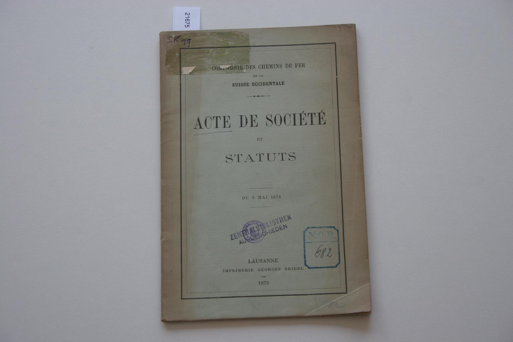 Titel: Compagnie des Chemins de Fer de la Suisse Occidentale, acte de société et statuts du 8. Mai 1873 Auteur(s): - 1675 - Compagnie des Chemins de Fer de la Suisse Occident... [€ 6,00] |