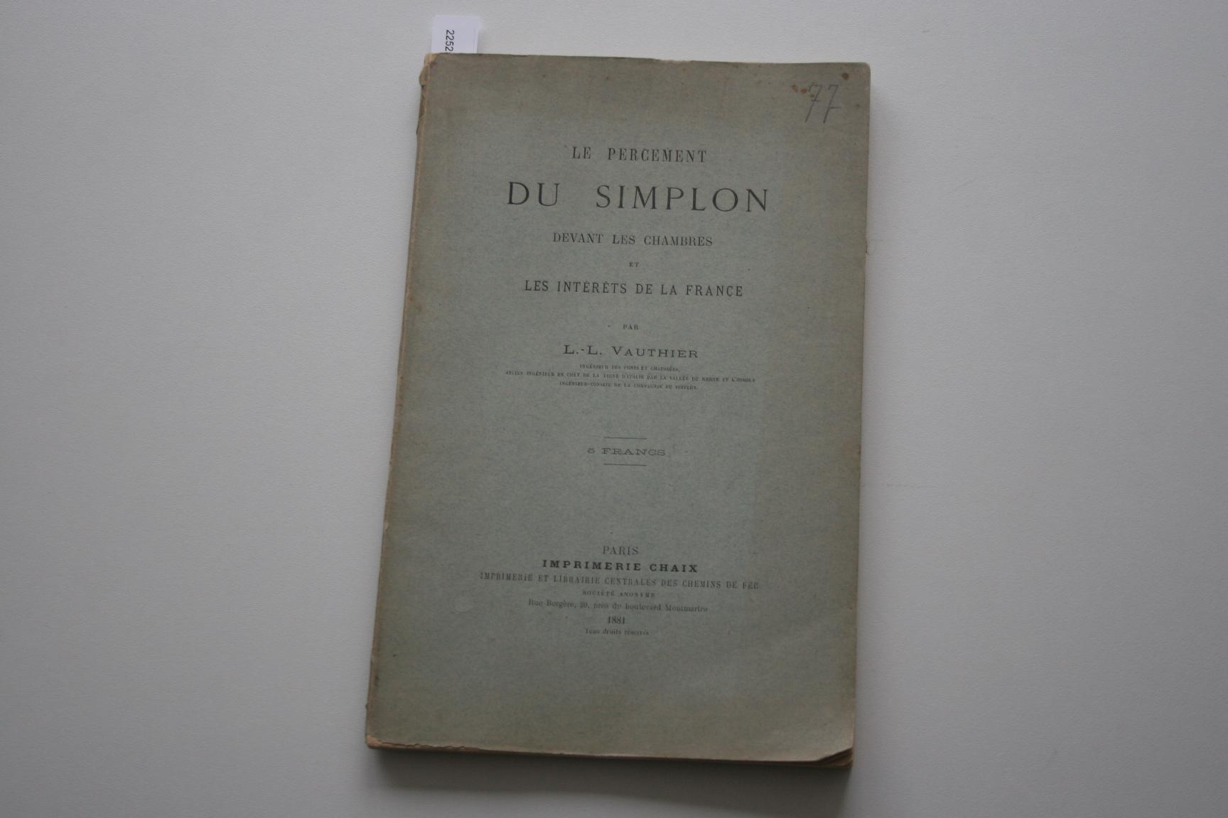 Titel: Le percement du Simplon devant les Chambres et les Intéréts de la France Auteur(s): Vauthier, L.-L. 2525 - Le percement du Simplon devant les Chambres et les... [€ 12,00] |