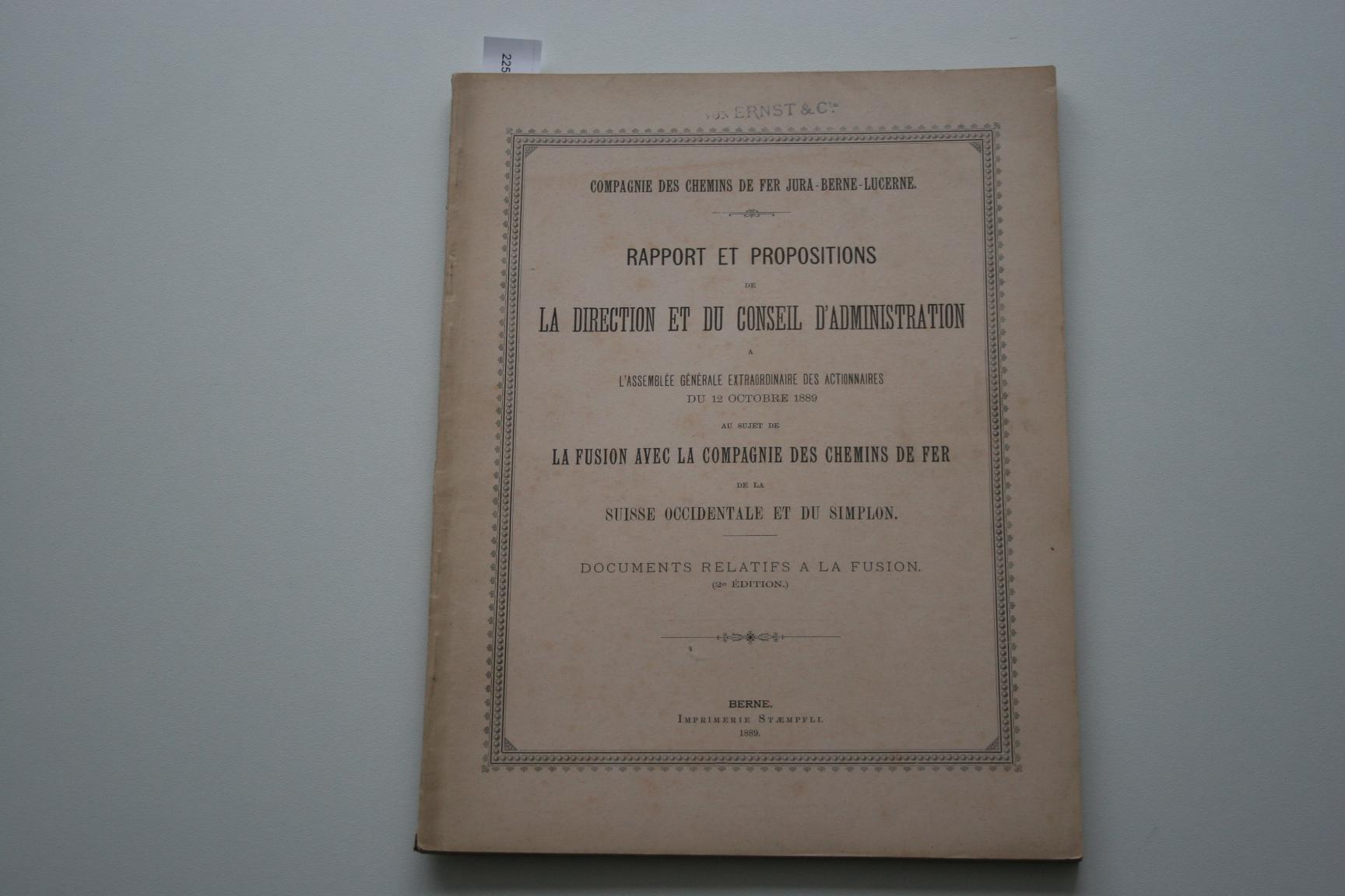 Titel: Rapport et propositions de la diection et du conseil d'administration … au sujet de la fusion avec la Compagnie des Chemins de Fer de la Suisse Occidentale et du Simplon Auteur(s): - 2528 - Rapport et propositions de la diection et du conse... [€ 15,00] |