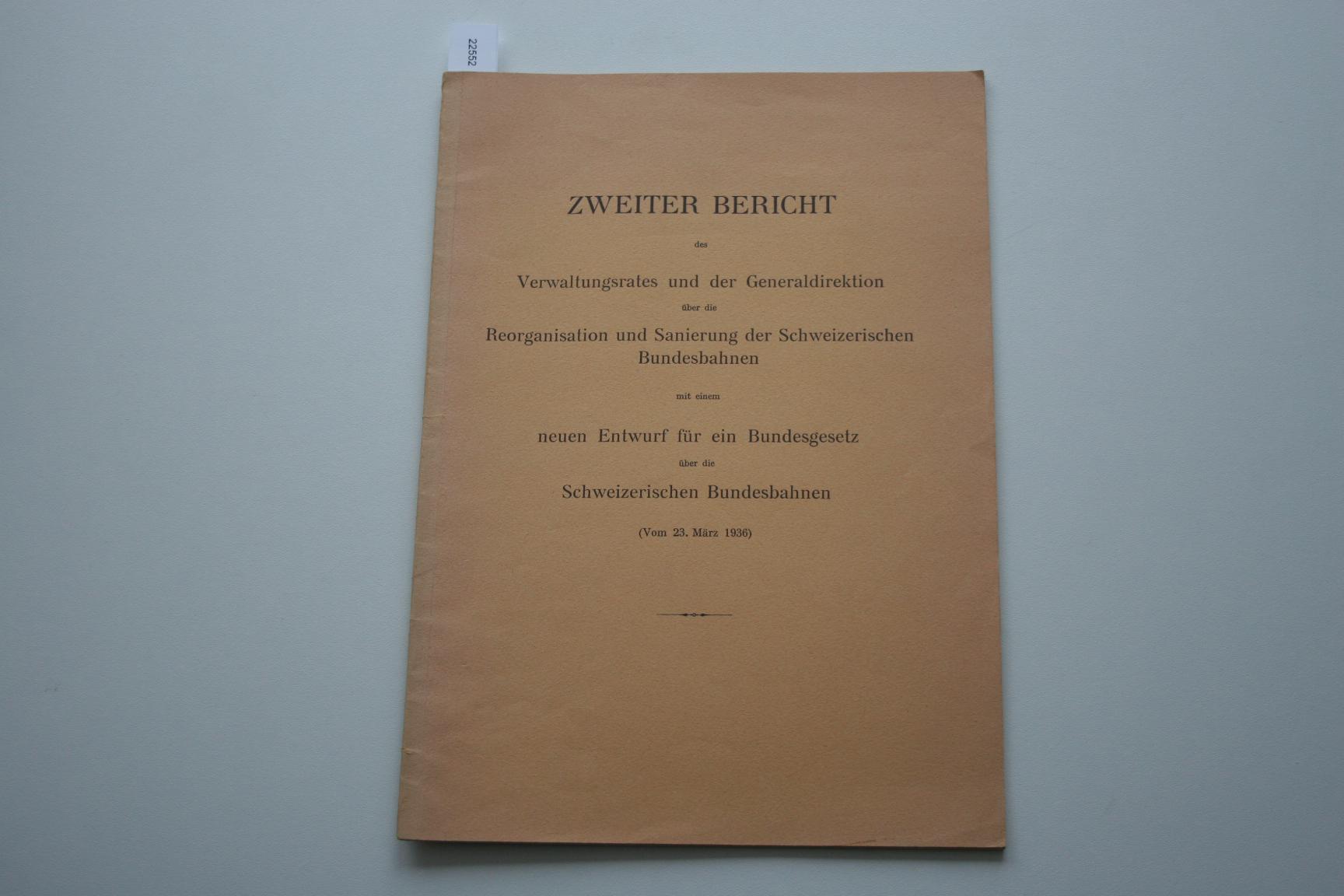 Titel: Reorganisation und Sanierung der Schweizerischen Bundesbahnen mit einem neuen Entwurf für ein Bundesgesetz (Vom 23. März 1936) Auteur(s): - 2552 - Reorganisation und Sanierung der Schweizerischen B... [€ 6,00] |