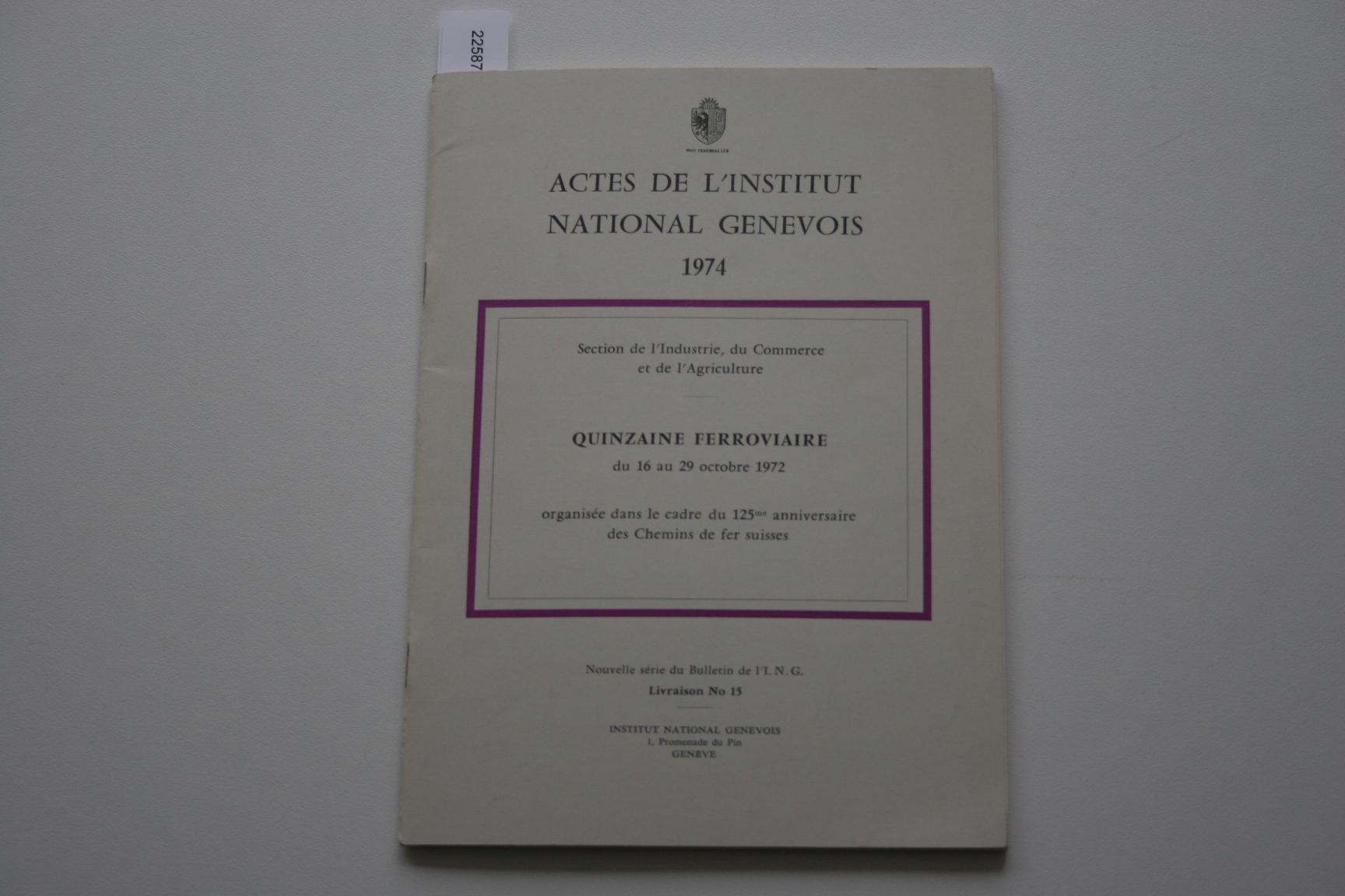 Titel: Actes de l'Institut National Genevois 1974, Quinzaine Ferroviaire du 16 au 29 octobre 1972, organisée dans le cadre du 125me anniversaire des Chemins de fer suisses Auteur(s): - 2587 - Actes de l'Institut National Genevois 1974, Quinza... [€ 2,00] |